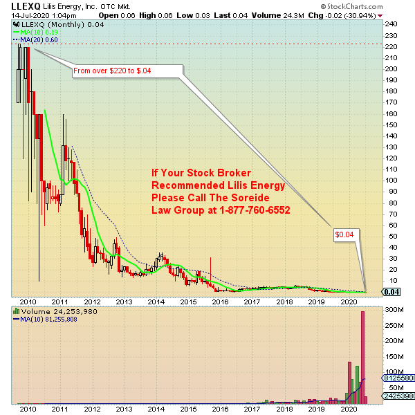 Lilis Energy, symbol LLEX and now LLEXQ, announced they are filing for Chapter 11 bankruptcy protection in Texas. The stock opened trading around $220 and was recently trading around $.04 rendering the stock almost worthless. Stock brokers that recommended this risky security and failed to limit losses for clients may be liable for those losses. For a broker to act as a fiduciary they must do what is in the best interest of the client and manage the risks involved with a security. Customers that still have this in their portfolio may be likely to have other such risky investments as well and could have lost their retirement money or other funds.