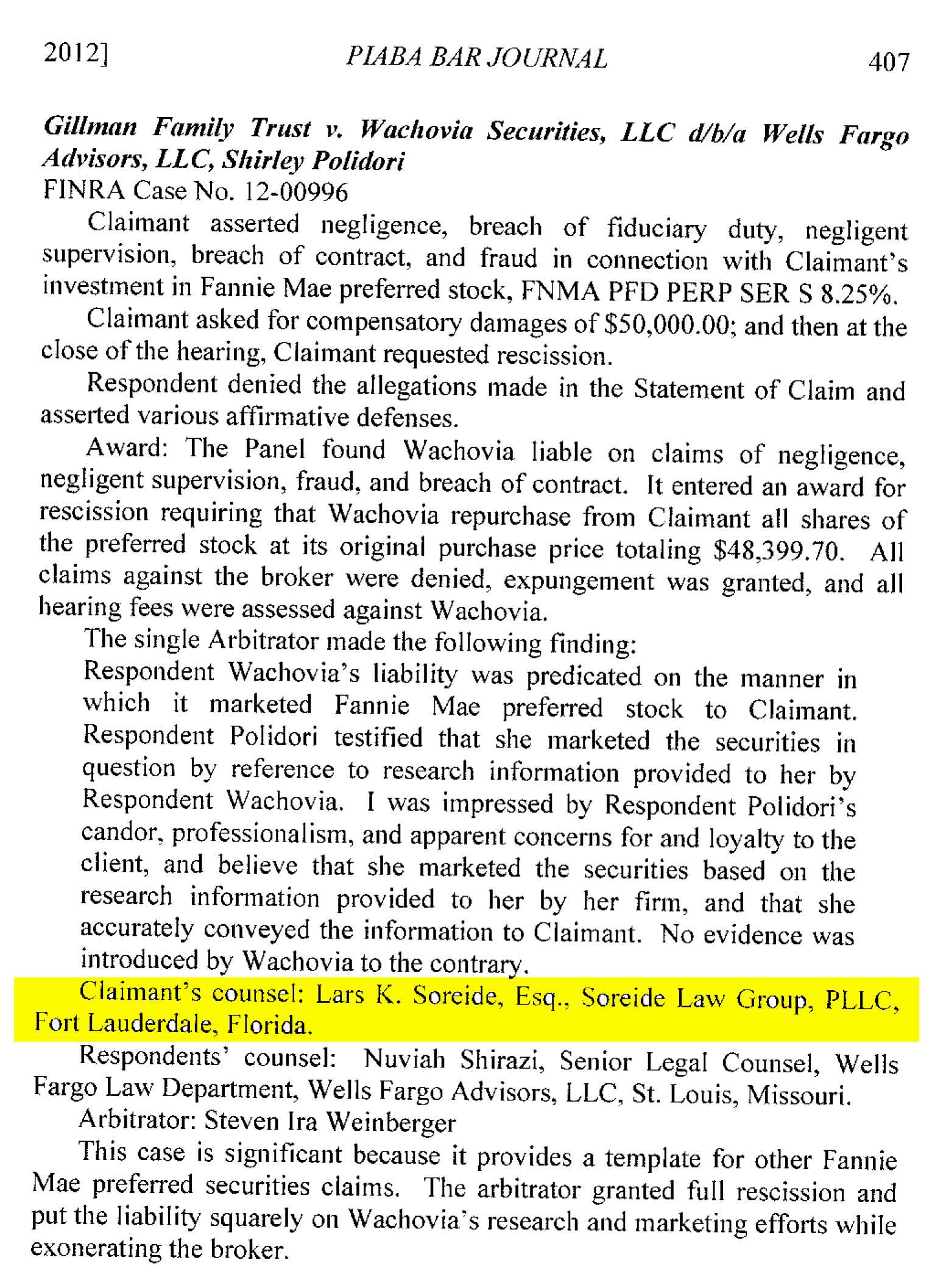 Click Here Lars Soreide was recognized in the PIABA Bar Journal for an award won on behalf of a client that was significant and worthy of national recognition regarding Fannie Mae securities.