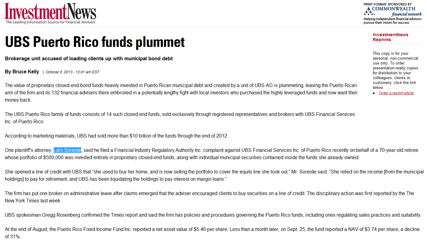 Click Here Lars Soreide was interviewed for Investment News regarding UBS Puerto Rico Bond Fund Losses.