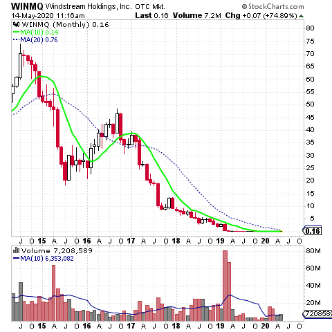 Windstream as of May 8th is attempting to exit bankruptcy and Judge Robert Drain has approved an equity backstop agreement that could help it exit. Low ranking creditors apposed this recent deal and say related rights offerings isn’t necessary. The underlying stock of Windstream Holdings, Inc. is symbol WINMQ and has fallen from about $75 per share to $.16 which has obviously hurt investors badly. Many brokers failed to limit losses in the decline and do their fiduciary duty to their clients by advising them to hold the entire way down.